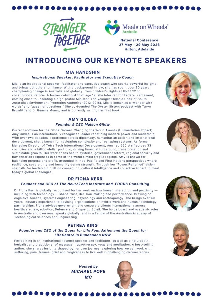 Join us in the heart of Adelaide for three inspiring days of connection, collaboration and celebration. Meals on Wheels Australia’s National Conference will bring together staff, volunteers, sponsors and supporters from across the country to share ideas, spark innovation and strengthen our shared mission of nourishing communities.